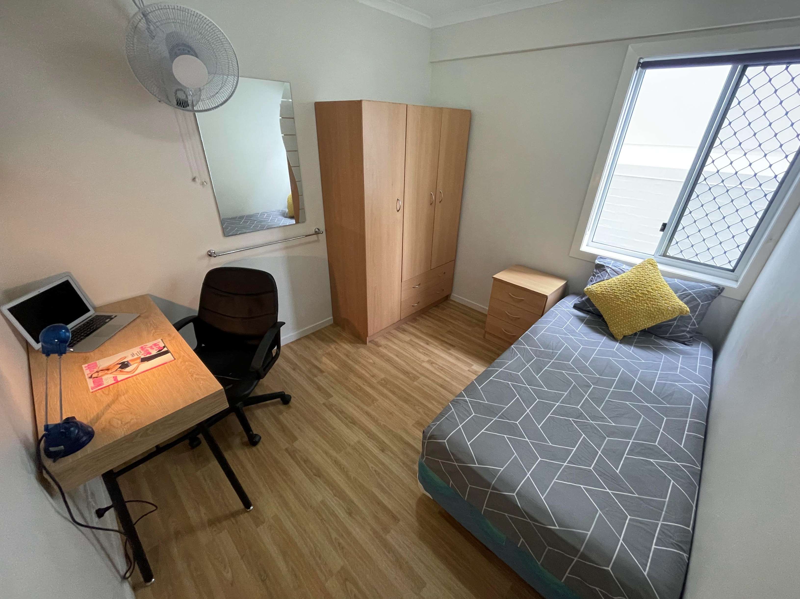 Spacious Room | Shared Bathroom | Bed with bedside table (bed size varies with each room) | Study desk & chair | Spacious Wardrobe | Individually lockable room for privacy