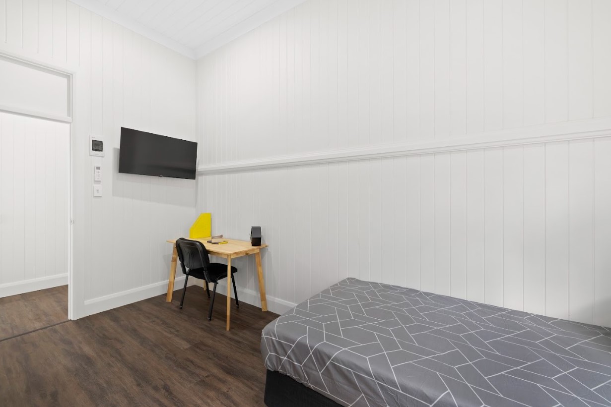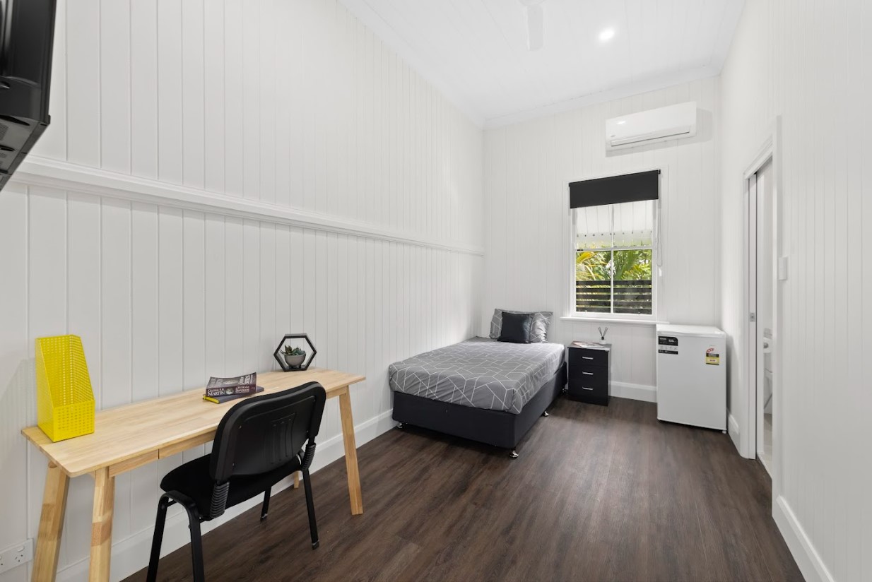 Spacious Room | Private Ensuite Bathroom | Air Conditioning & Ceiling Fan | Bed with bedside table (bed size varies with each room) | Study desk & chair | Spacious Wardrobe | Individually lockable room for privacy | Wall-mounted TV | Mini Fridge